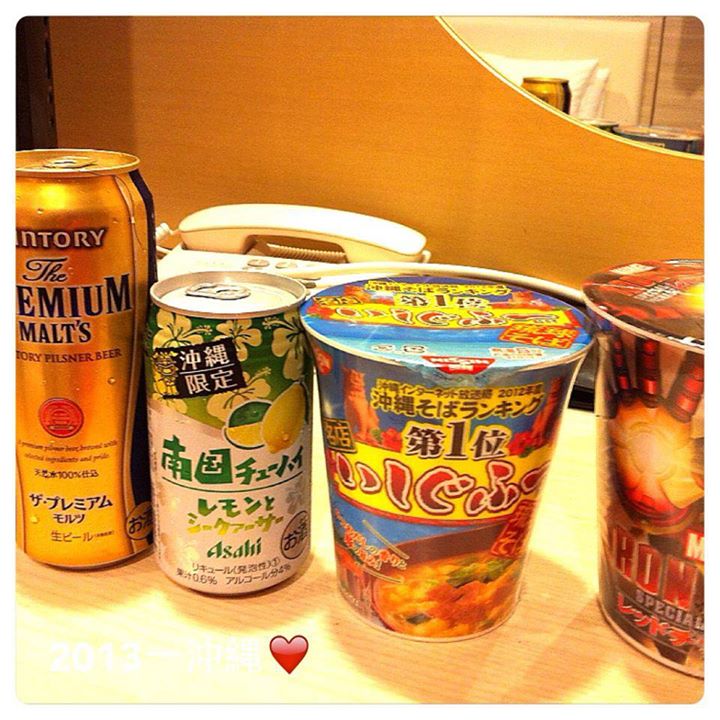 因為班機delay的問題,我們抵達沖繩的時間已經接近當地時間晚上10點了,不知道是全日本還是只有沖繩,10點對台灣來說才剛開始而已,他們的店都打烊的差不多了(八點就陸續有店開始打烊了 = =”),只剩下幾間吃東西的店還有開著而已。原本最初的計畫是要趕在九點之前抵達飯店,然後殺去一間在飯店旁邊叫「大溪」的店吃東西順便看表演,但一切都來不及了阿~~~最後我們選擇了便利商店陪伴我們度過第一個晚上。
